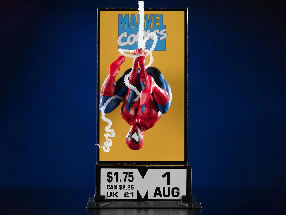 The statue features Spider-Man hanging upside down from a web on a yellow background, perfectly capturing the look from the artwork used in the Spider-Man #1 comic’s corner box.